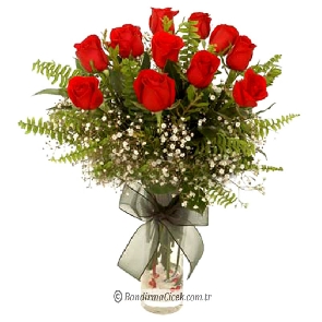 silindir cam vazo içerisinde gipso ve yeşilliklerle süslenmiş 11 adet kırmızı gül.